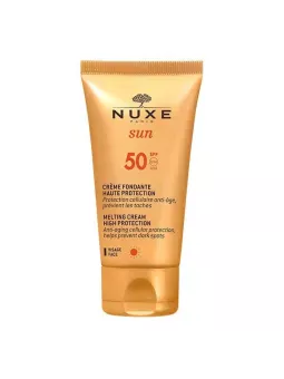 Nuxe Sun Crème Fondante Visage SPF 50 50 ml est une haute protection solaire au parfum de vacances qui garantit un bronzage 100% naturel et glamour.